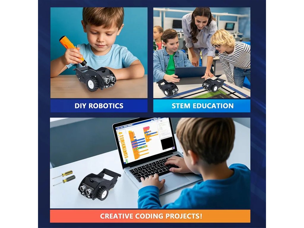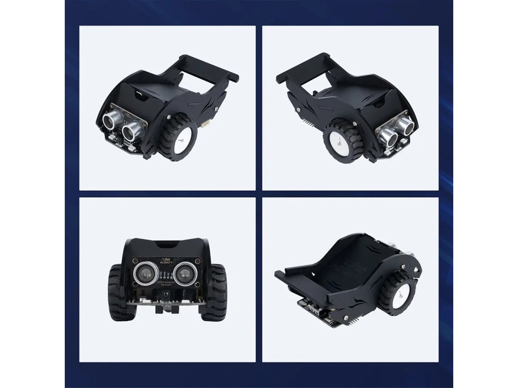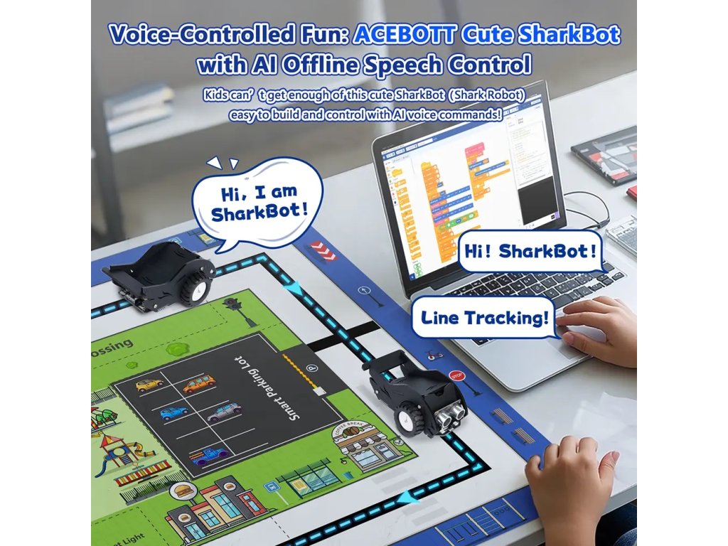 Sada do auta SharkBot kompatibilní s Arduinem, Pythonem a ACECode Offline rozpoznávání hlasu (přizpůsobitelné hlasové příkazy pomocí ACECode) Robotické auto ACEBOTT SharkBot je vybaveno offline rozpoznáváním hlasu, které umožňuje bezproblémové ovládání pomocí přizpůsobitelných hlasových příkazů přes ACECode. Po nastavení funguje bez připojení k internetu, což umožňuje ovládání bez použití rukou kdykoli a kdekoli. Tato funkce vylepšuje interaktivní učení a dělá programování poutavějším a intuitivnějším. Sledování 4 směrů a vyhýbání se překážkám Náš SharkBot, vybavený čtyřsměrným sledováním linií a funkcí vyhýbání se překážkám, se autonomně pohybuje ve složitých prostředích a efektivně se jim vyhýbá. Tato technologie poskytuje hlubší pochopení autonomní navigace a inteligentního řízení, což z něj činí vynikající nástroj pro učení robotiky a umělé inteligence. Infračervené dálkové ovládání a zobrazení stavu baterie Součástí balení je infračervené dálkové ovládání, které umožňuje snadné ovládání na velké vzdálenosti. Zobrazení stavu baterie v reálném čase vám umožňuje sledovat stav nabití na první pohled, čímž se zabrání neočekávaným vypnutím a umožní se nerušené používání. Rozšiřující porty I2C a servo pro nekonečné možnosti přizpůsobení Robotické auto ACEBOTT SharkBot je vybaveno offline rozpoznáváním hlasu, které umožňuje bezproblémové ovládání pomocí přizpůsobitelných hlasových příkazů přes ACECode. Po nastavení funguje bez připojení k internetu, což umožňuje ovládání bez použití rukou kdykoli a kdekoli. Tato funkce vylepšuje interaktivní učení a dělá programování poutavějším a intuitivnějším.Doplňkové parametry