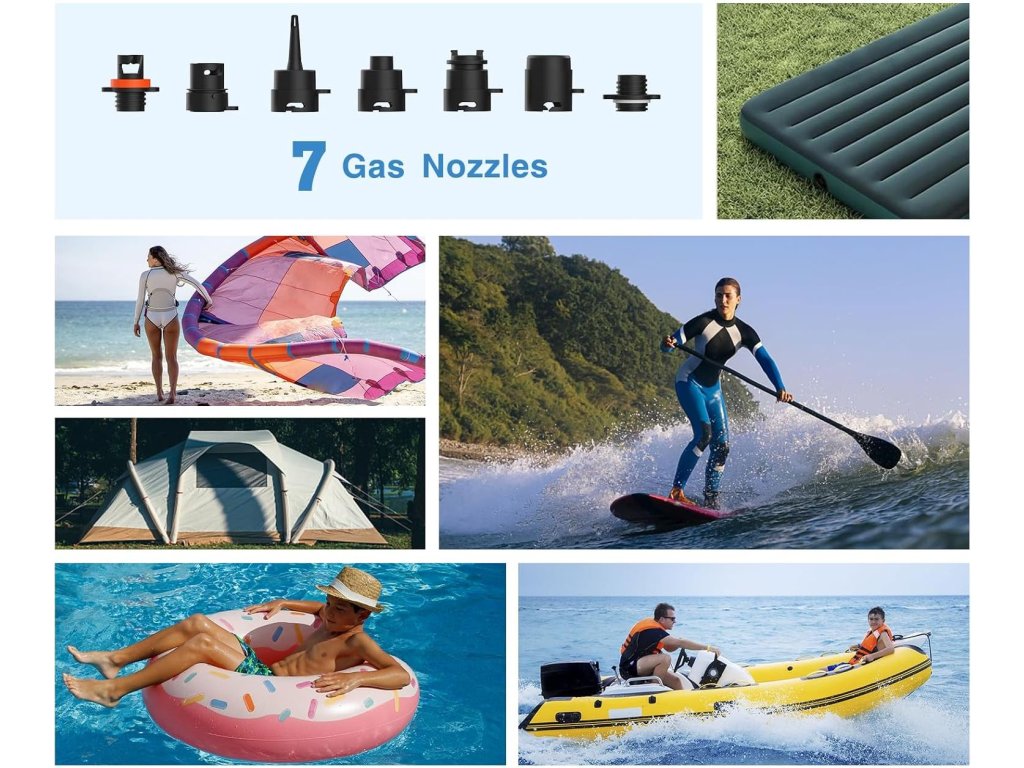 Díky praktické kombinaci akumulátoru, nabíjení přes USB-C a napájení skrze adaptér do auta můžete pumpu snadno dobít kdekoliv. Navíc se sedmi různými nástavci zvládnete nafouknout paddleboardy, čluny, lehátka i další vodní vybavení. Jednoduše nastavte požadovaný tlak a nechte čerpadlo pracovat, které se automaticky zastaví, jakmile je dosaženo cílového tlaku. |
