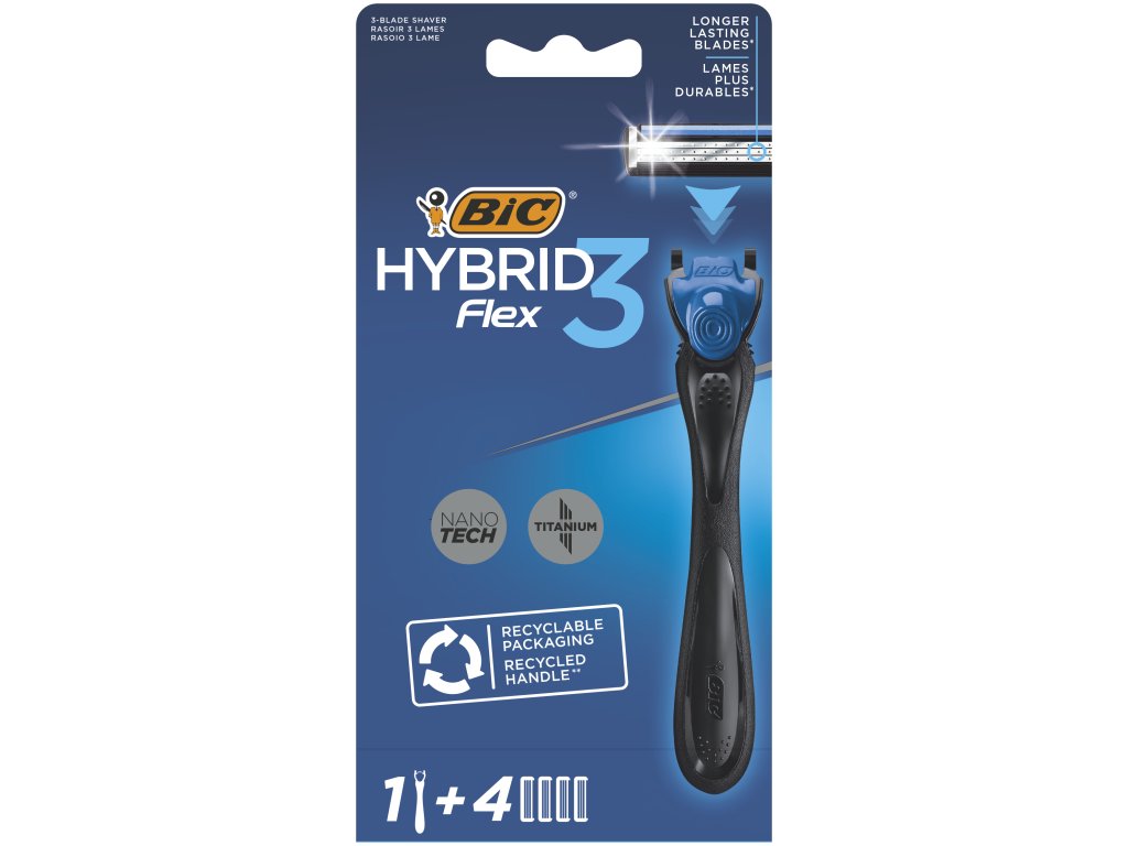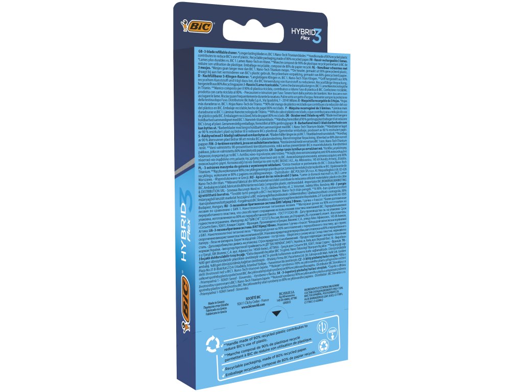 Výhodná ECO sada balení, kdy strojek je vyroben z 90% z recyklovaných plastových materiálů a balení z 80% z recyklovaného papíru a dále recyklovatelné. Sada obsahuje všestranný pánský holicí strojek BIC Flex3 Hybrid s jednou rukojetí a 4 náhradními hlavicemi se třemi odpruženými a pohyblivými břity. Samotné břity byly upraveny pomocí nanotechnologie a díky tomu se lehce přizpůsobí konturám Vašeho obličeje, aby zajistily hladké oholení a snadné opláchnutí břitů. Vaše pokožka navíc ocení zklidňující péči širokého lubrikačního proužku obohaceného o vitamín E a Aloe veraDoplňkové parametry