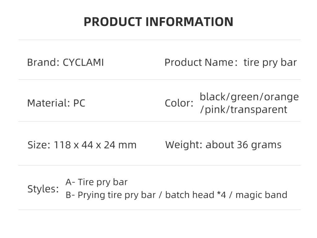 CYCLAMI QT2‑B je kompaktní multifunkční páčidlo určené pro rychlé sejmutí pláště a drobné opravy na cestách. Kombinuje klasickou montpáku s praktickou sadou bitů a hákovým kroužkem, takže nahrazuje malý cyklo multitool. Díky nízké hmotnosti a odolnému PC materiálu je ideální do kapsy dresu, brašny i bikepackingové výbavy.