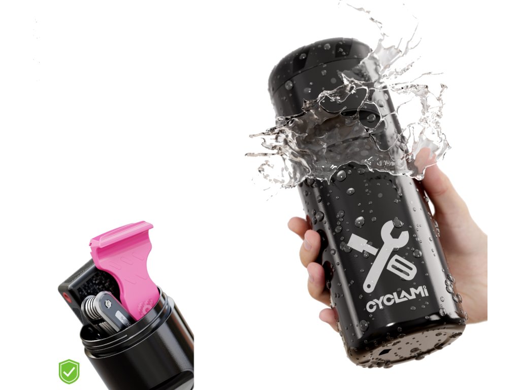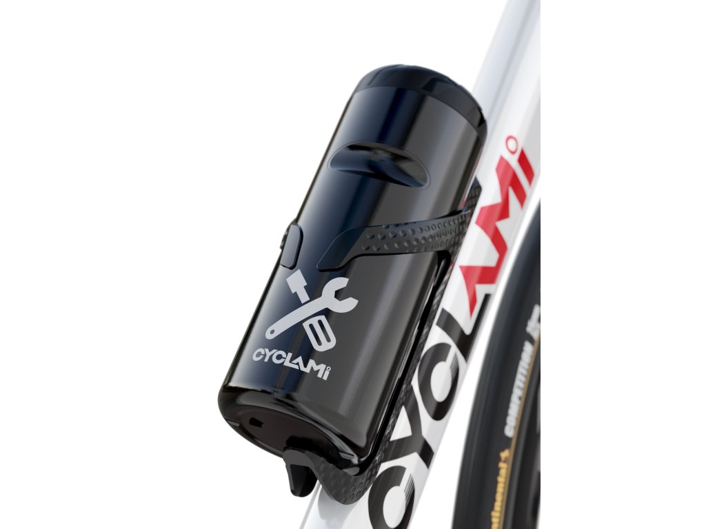 Voděodolný plastový box na nářadí, pumpičku, lepení, duše a podobné příslušenství do držáku na bidony. Díky rozměrům 19,5x7,4mm je kompatibilní se všemi standardními košíky na bidonu. Balení obsahuje 2ks ultralehké silniční TPU duše s galuskovým ventilkem o délce 45mm, mutlifunkční nástroj plnící funkci montpáky a zároveň držáku bitů, sadu bitů, 4 samolepicí záplaty na TPU duši, čisticí ubrousky na TPU duši pro pevnější nalepení záplaty. To vše v praktickém textilním váčku chránící nářadí a box před poškozením. Hmotnost boxu bez nářadu: 64gDoplňkové parametry