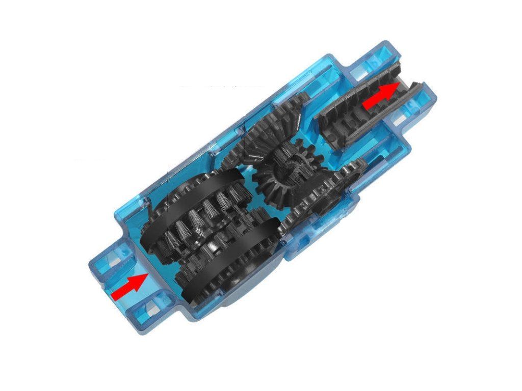 Sada funguje pomocí šesti rotačních kartáčů s krátkými a dlouhými štětinami a čistí řetěz po stranách, nahoře, dole a mezi články. Po vyčištění lze všechny části snadno rozložit a vyčistit.