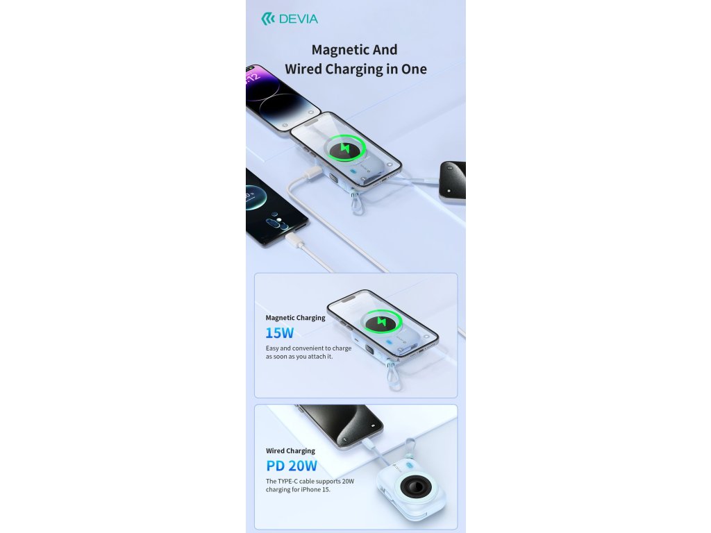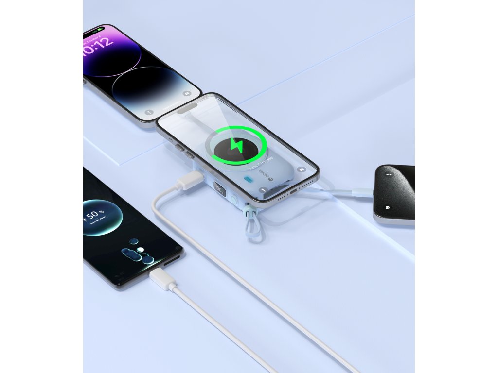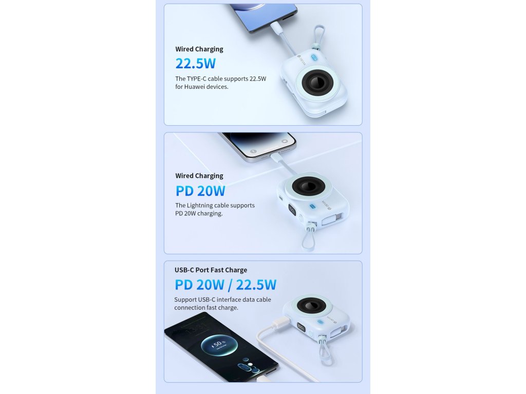 Tato powerbanka nabízí rychlé nabíjení dvěma kabely s magnetickým nabíjením 15 W a prostřednictvím přiložených duálních kabelů TYPE-C pro iPhone 15 a 22,5 W pro zařízení Huawei, zatímco kabel Lightning podporuje nabíjení PD 20 W.