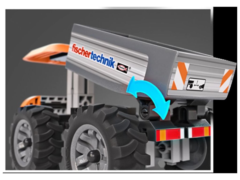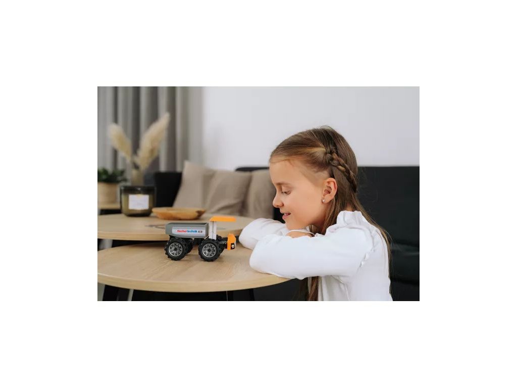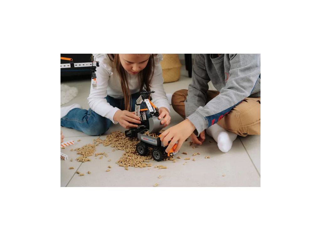 - Nákladní vůz fischertechnik s výklopným ložným prostorem bezpečně přepravuje těžké náklady po staveništi
