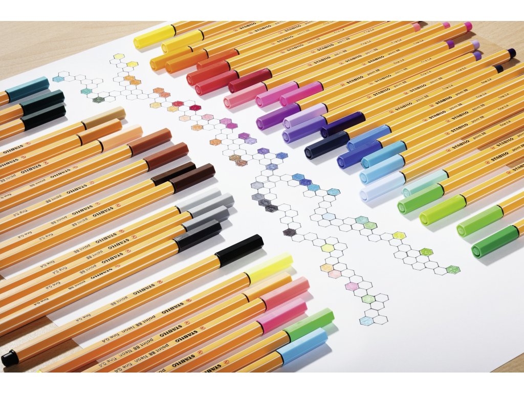 Jemná linka a nezaměnitelný tvar a barva těla STABILO point 88 jsou známkou preciznosti a široké škály barev. Ne nadarmo je na trhu v Evropě STABILO point 88 číslem jedna. Jeho hrot zasazený do kovového pouzdra byl nesčetněkrát zdrojem skvělých nápadů a důmyslných myšlenek; ať už v práci, ve škole, v každodenním životě nebo ve chvílích kreativity - STABILO point 88 je vaším dokonalým společníkem.