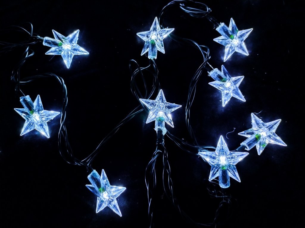 LED světelný řetěz s LED světly ve tvaru hvězdy, snadno tvarovatelný. Délka 5m. Napájen pomocí solární panelu, automatické vypnutí po 8h. Studené bílé světlo