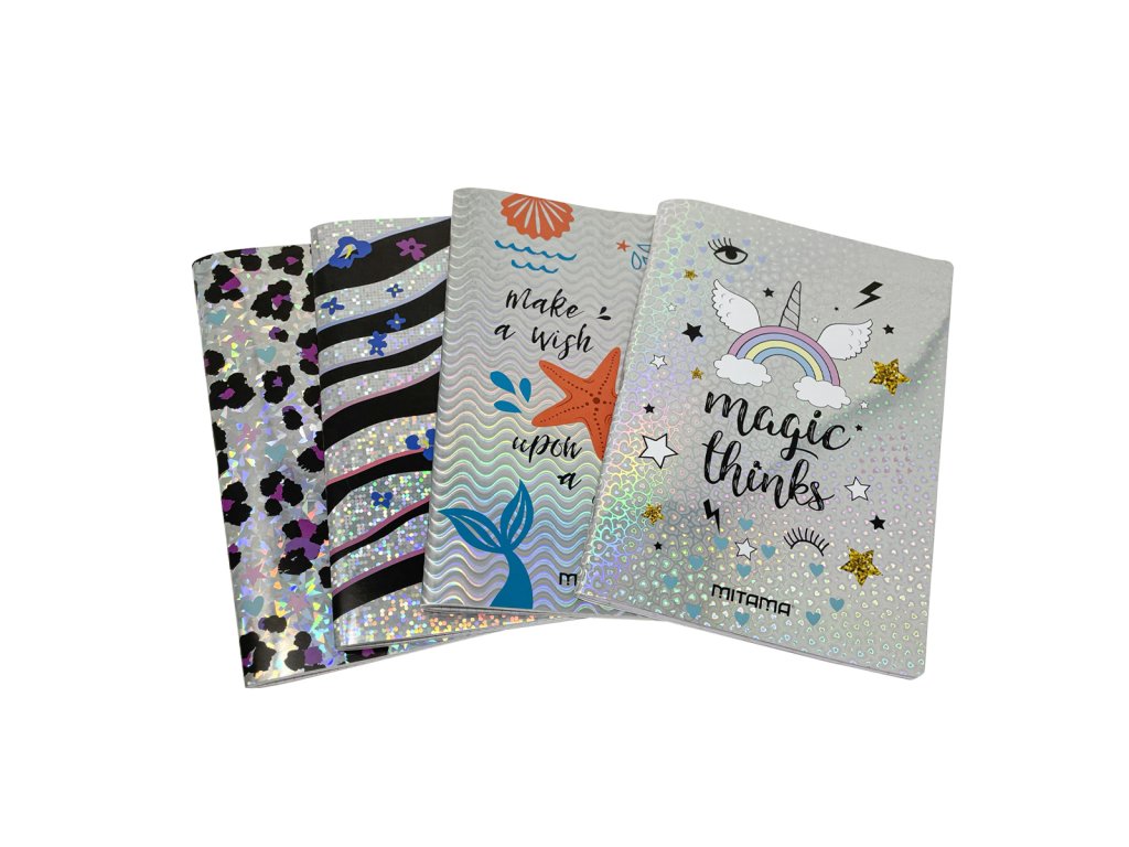 Sešit A4, linky, 40+2 stran, 80gr., řádky 5mm, FSC papír, lakované desky - různé motivy - lesklé a blýskající se. Velikost: 21x29,7cm