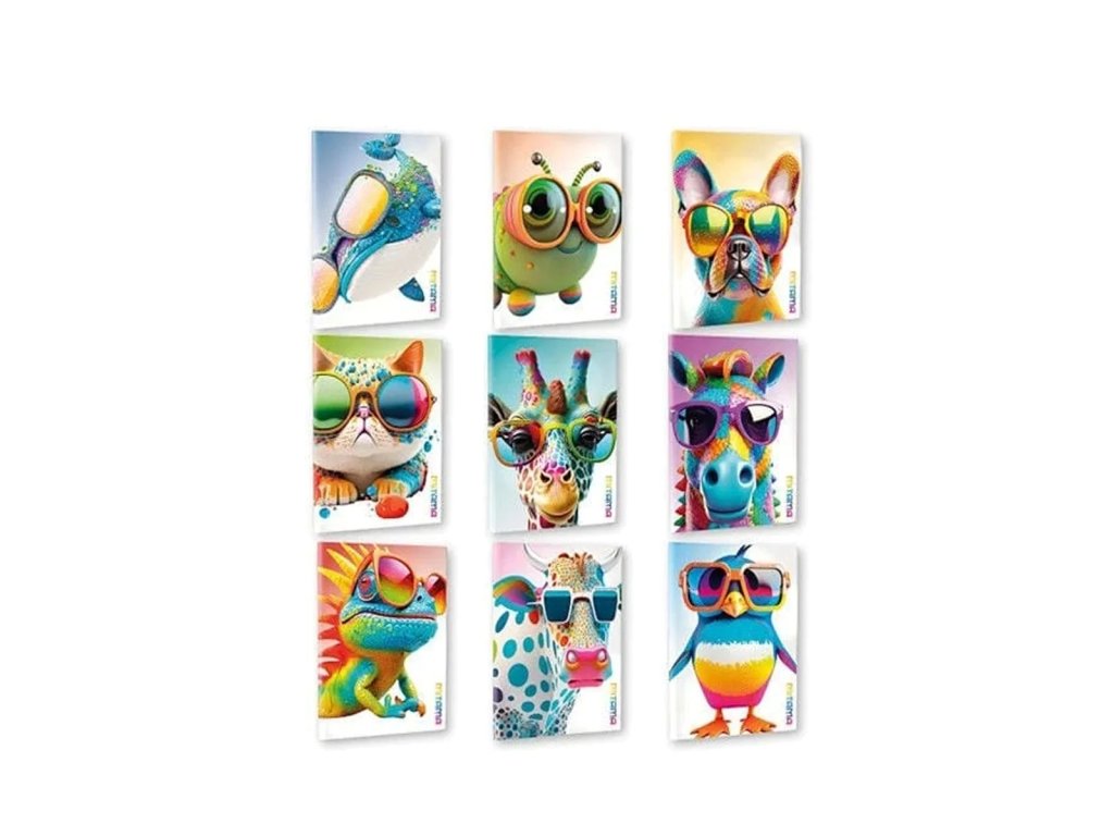 Sešit A4, čtverečky, 40+2 stran, 80gr., FSC papír, lakované desky - různé motivy - veselá zvířátka. Velikost: 21x29,7cm