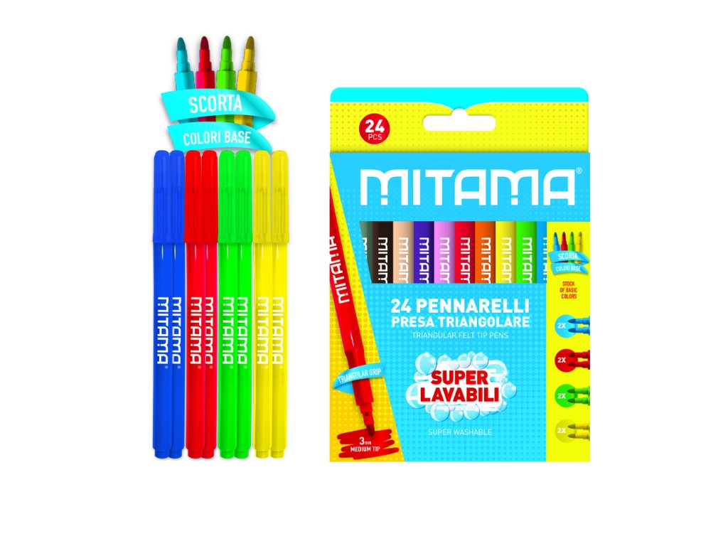 Super omyvatelné fixy s trojúhelníkovým úchopem, který usnadňuje správný úchop fixu zajišťující maximální pohodlí. Kulatá hlaveň a průhledný uzávěr se zaoblenou a odvětrávanou špičkou. 3mm jemný hrot, různé barvy. Balení se skládá z 24 kusů. 16 různých barev + 2 modré, 2 červené, 2 zelené a 2 žluté. Netoxický inkoust SPECIFIKACE • Barva inkoustu: Různé • Typ hrotu: jemný 3 mm • Omyvatelný Ano • Materiál: plast • Ergonomický design: trojúhelníková rukojeť • Typ inkoustu: Netoxický inkoust • Počet kusů v balení: 24Doplňkové parametry