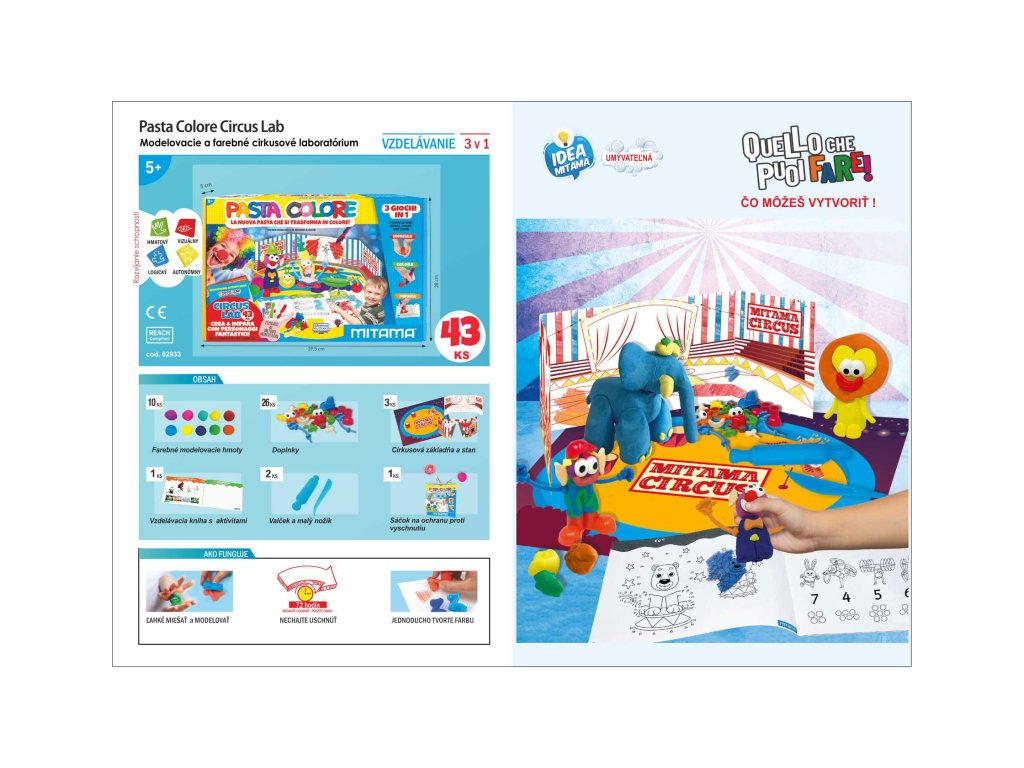 Fantastická cirkusová laboratoř, kterou lze vyrobit pomocí super nové a originální modelovací a barvicí pasty. 2 hry v 1. Měkká modelovací hmota s inovativním složením, která vám umožní modelovat požadované tvary a po zaschnutí ji můžete použít k barvení! Vytvořte si své vlastní cirkusové postavy a doplňte je různými doplňky, které jsou součástí balení. Uvnitř krabice: 10 modelovacích a barvicích past, 1 cirkusový stan, několik doplňků pro vytvoření postav, taška pro uložení hlíny, kniha aktivit a barevná kniha pro vytvoření vlastního zábavního světaDoplňkové parametry