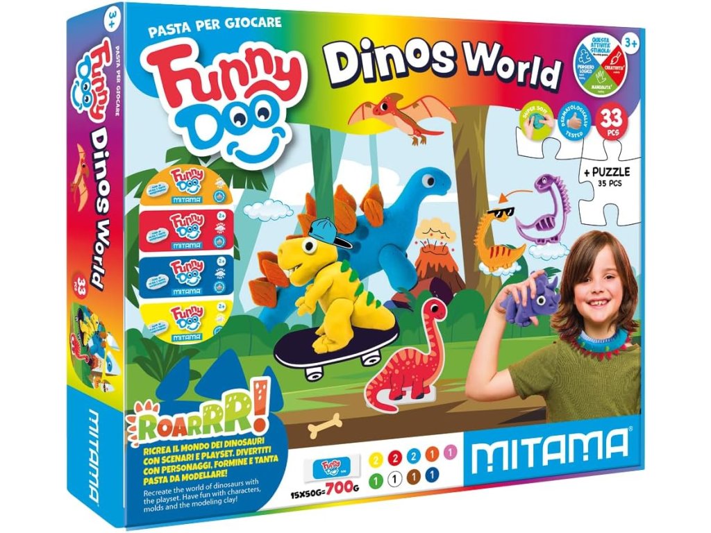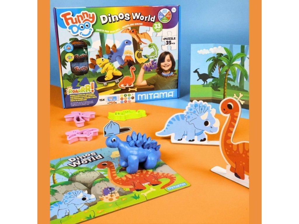 Objevte svět plný fantazie, barev a tvoření s hracím boxem Mitama Dinos World. Tato kreativní sada je navržena pro malé objevitele od 3 let, kteří milují modelování, skládání a hraní si s dinosaury. Díky bohatému příslušenství podporuje rozvoj jemné motoriky, kreativity i představivosti.