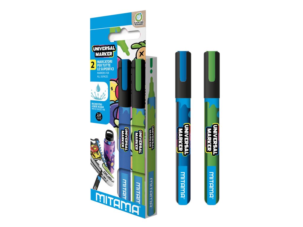 MITAMA Popisovač na vodní bázi na všechny povrchy 2 ks - modrá,zelená Sada univerzálních popisovačů MITAMA, která obsahuje dva univerzální popisovače, perfektní volba pro značení všech typů povrchů. Fixy jsou voděodolné a díky svým rychleschnoucím vlastnostem zaručují odolné psaní a kreslení bez rozmazání. Hroty s různou tloušťkou čar (2-8 mm) vytvářejí nejpřesnější kresby a jasně viditelné čáry. Vlastnosti : • Voděodolný a rychleschnoucí: Trvalé značení na různých površích. • Tloušťka čáry 2-8 mm: Ideální pro přesné kreslení a psaní. • Ergonomický design: Pohodlné uchopení i při dlouhodobém používání. • Univerzální použití: Perfektní pro jakýkoli povrch! S univerzální sadou popisovačů MITAMA jsou všechny typy psaní a kreslení snadné a efektivní.Doplňkové parametry