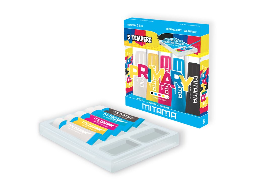 Vysoce kvalitní omyvatelné temperové barvy: více krycí, plnější, tekutější. Balení obsahuje 5 základních barev po 21 ml • Balení 5 barev připravených k použití v praktických průhledných tubách ze 100% recyklovatelného materiálu • Brilantní barvy, mísitelné prsty • Snadno se smyjí z pokožky a většiny tkanin, takže jsou ideální pro dětské aktivity a bezstarostné čištění • Tempery jsou v 5 základních barvách (černá, modrá, červená, žlutá a bílá), které lze díky barevnému průvodci obsaženému v balení smíchat a vytvořit mnoho dalších barev. • Balení se stává skutečnou paletou se 2 prostory pro míchání produktů • Tuby jsou vyrobeny z PP materiálu a mají praktický a inovativní design, který se snadno mačká a ovládáDoplňkové parametry
