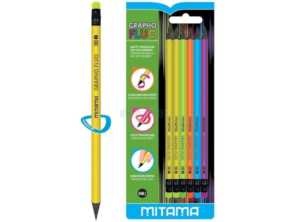 MITAMA Tužka grafitová trojhranná s gumou Fluo HB (2)/6ks