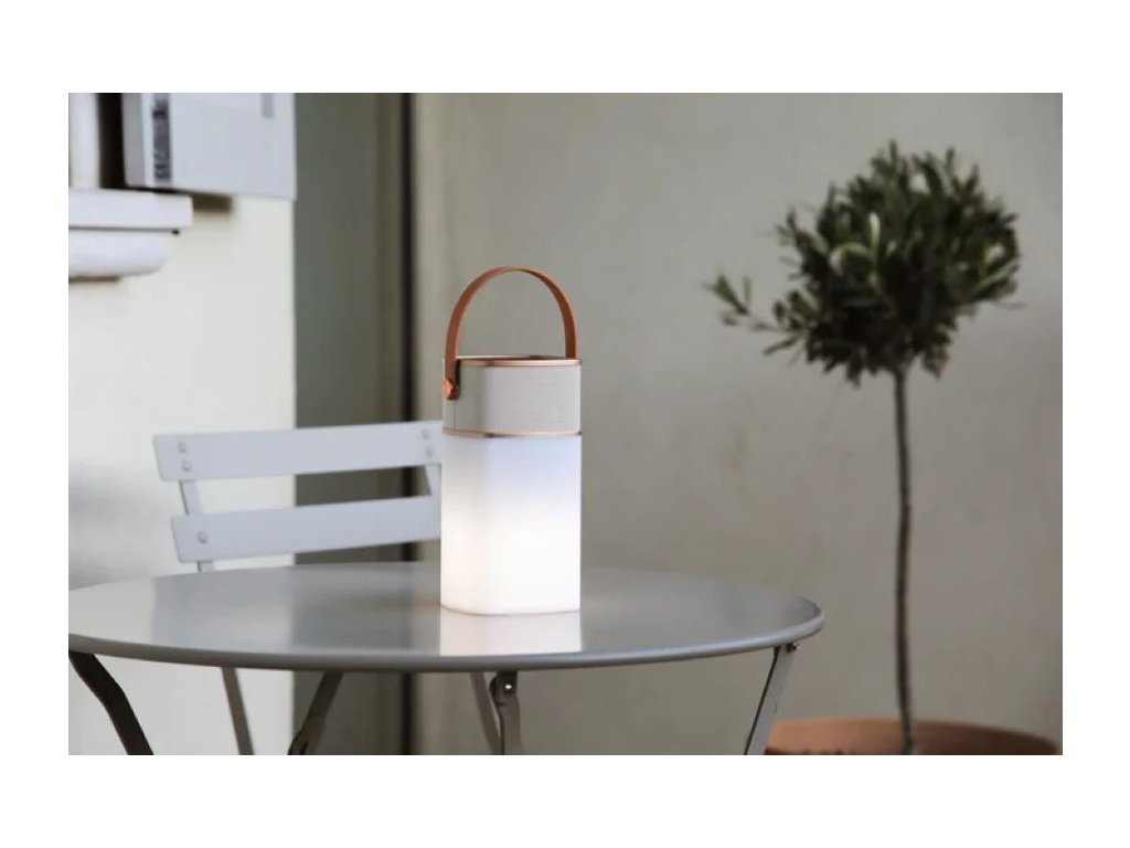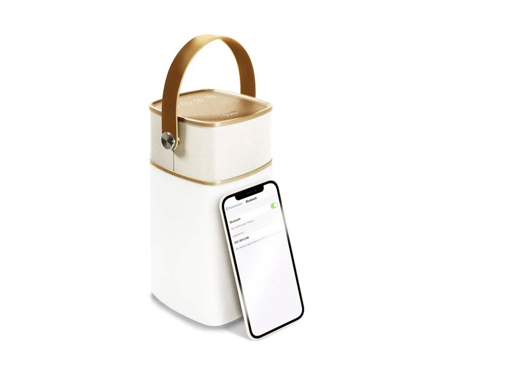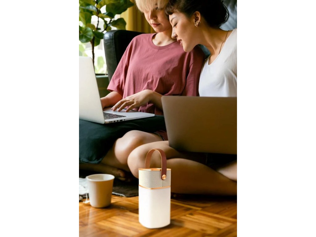 Designový přenosný reproduktor si vás získá na první pohled. Má hebkou povrchovou úpravu a je provedený v kombinaci bílé a zlaté barvy, které doplňuje elegantní kožené ucho. Součástí je také zabudovaná LED svítilna a powerbanka, takže si díky reproduktoru můžete posvítit ve tmě i dobít telefon.