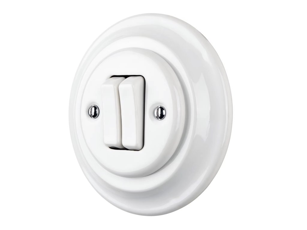 Retro pocelánový vypínač s dvěma přepínacími tlačítky v bílé barvě. Max. proud: 10A, max. napětí: 250V. Životnost: min 100000x. Materiál: porcelánové tělo, plastový mechanismus, kovDoplňkové parametry