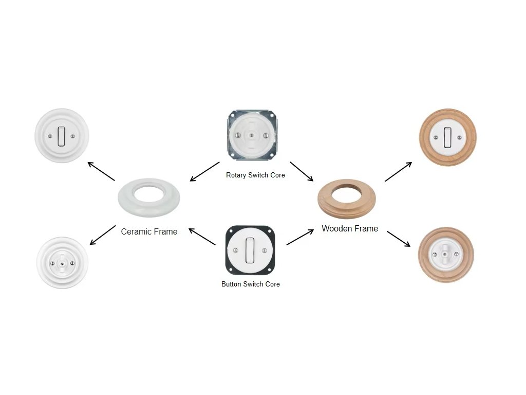 Porcelánový rámeček v retrostylu pro zásuvky a vypínače (montované pod omítkou).Kulatý design. Průměr otvoru: 50mm, celkové rozměry podložky: 100x10mmDoplňkové parametry