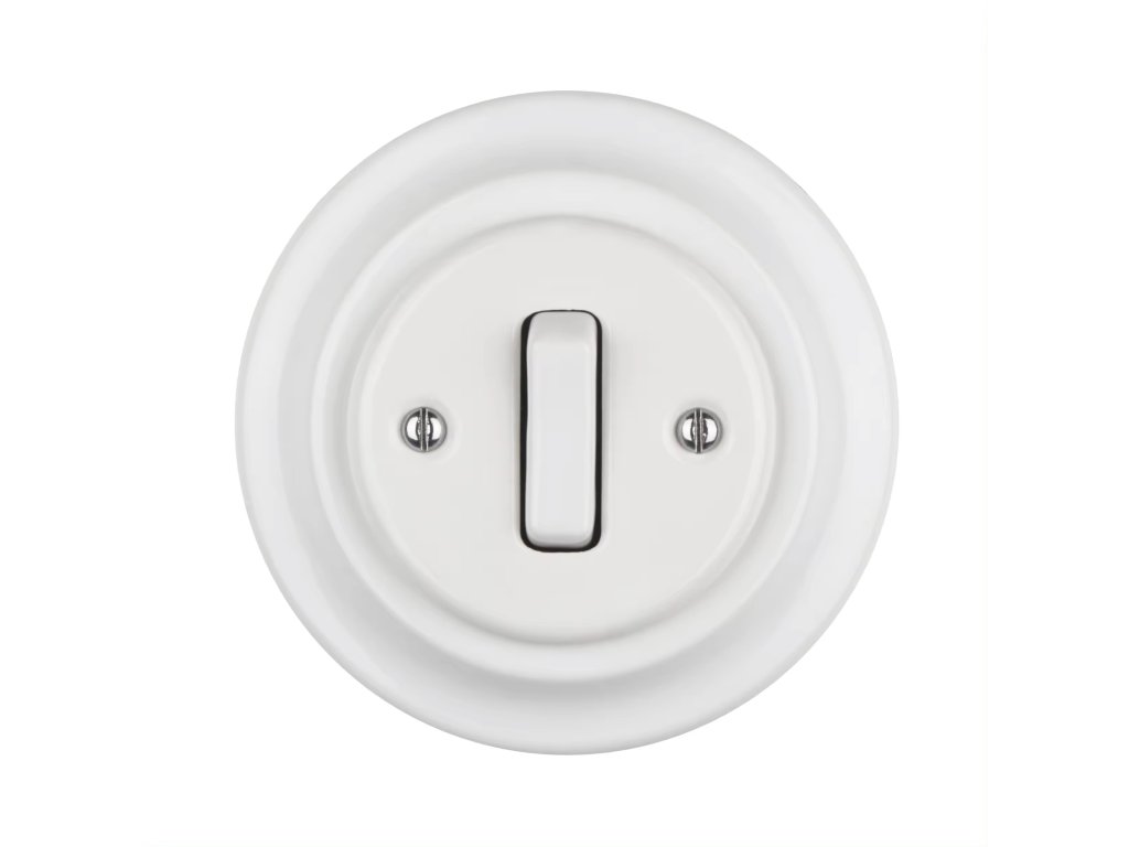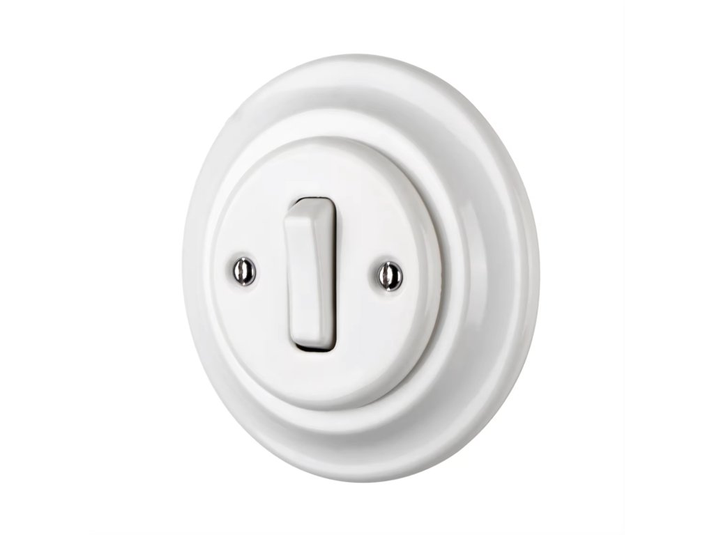 Retro pocelánový vypínač s jedním přepínacím tlačítkem v bílé barvěMax. proud: 10A, max. napětí: 250VŽivotnost: min 100000xMateriál: porcelánové tělo, plastový mechanismus, kovDoplňkové parametry