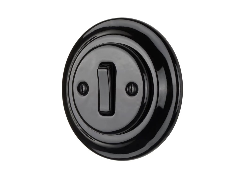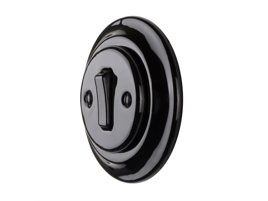 Retro pocelánový vypínač s jedním přepínacím tlačítkem černé barvěMax. proud: 10A, max. napětí: 250VŽivotnost: min. 100000xMateriál: porcelánové tělo, plastový mechanismus, kovDoplňkové parametry