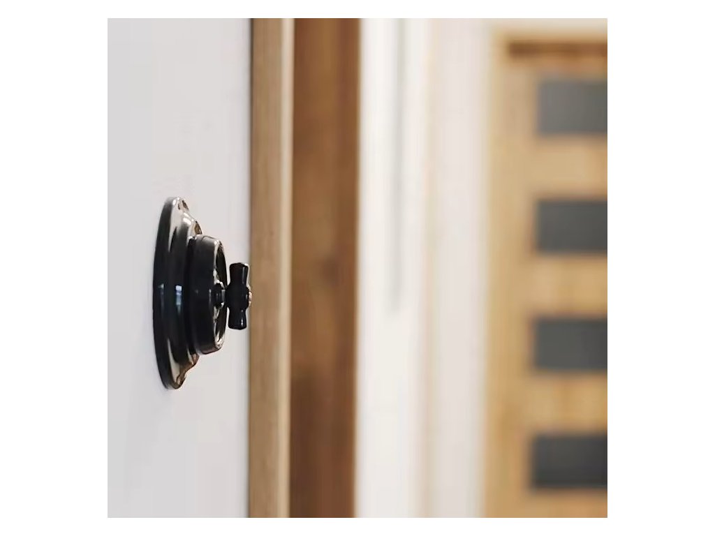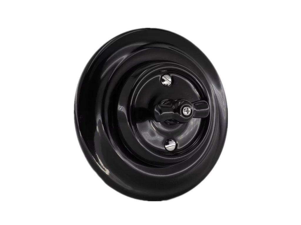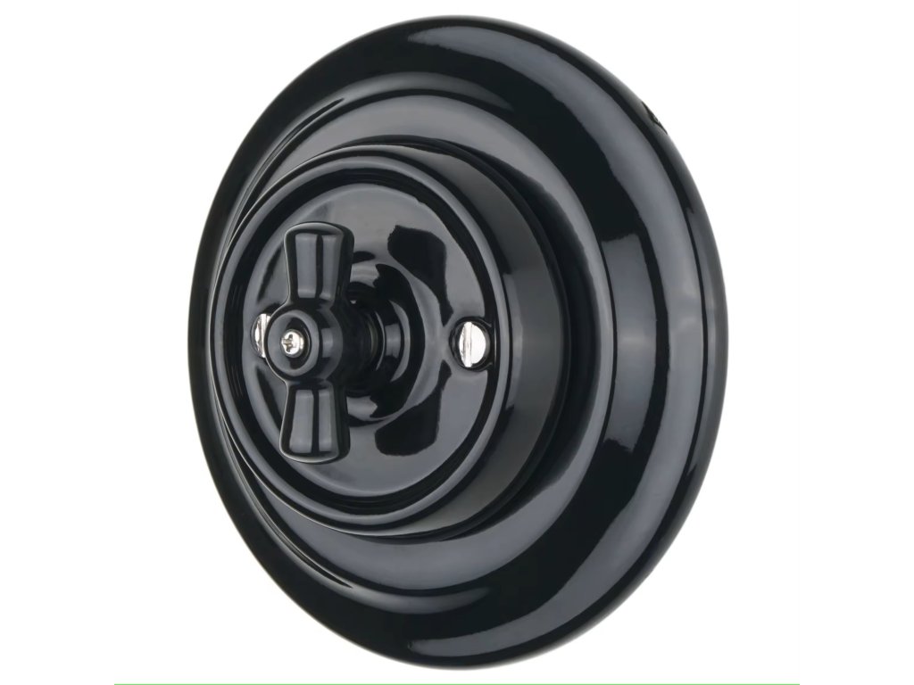 Retro pocelánový vypínač s jedním otočným tlačítkem v černé barvěMax. proud: 10A, max. napětí: 250VŽivotnost: min 100000xMateriál: porcelánové tělo, plastový mechanismus, kovDoplňkové parametry