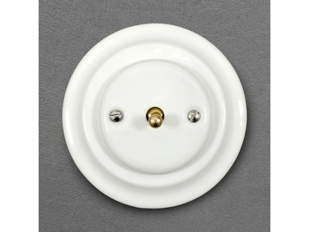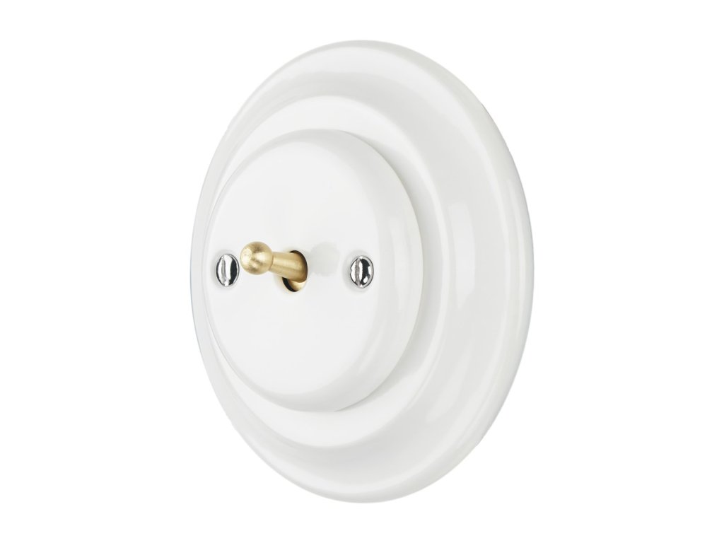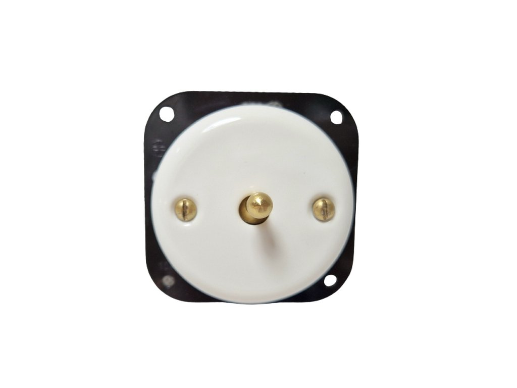 Retro porcelánový vypínač v bílé barvě s jedním kovovým přepínacím tlačítkem Schodišťový vypínač - možnost ovládání ze dvou míst Max. proud: 10A, max. napětí: 250V Životnost: min 100000x Materiál: porcelánové tělo, plastový mechanismus, kovDoplňkové parametry