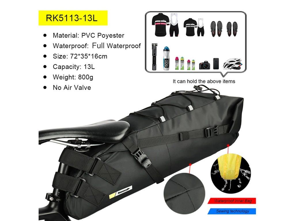Rhinowalk RK5110 je objemná, voděodolná a odolná podsedlová brašna určená pro několikadenní putování na kole. Díky adaptabilní velikosti, stabilnímu uchycení a možnosti komprese je ideální pro bikepacking bez potřeby nosiče.