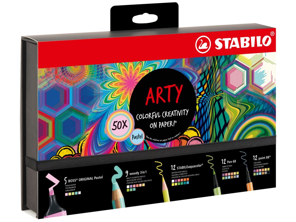 Pod barevně potištěnou fólií je umístěna kvalitní černá krabička z matného kartonu. Logo STABILO je vyraženo v horní části krabice. Pokud krabičku otevřete, barvy per září v intenzivním kontrastu s černým vnitřkem krabičky. Různé produkty jsou rozděleny samostatnými, černými přihrádkami, aby byl zajištěn přehled a řád v krabici. Prémiový vzhled a kvalita dělají z tohoto balení úžasný dárek pro každého kreativního ducha nebo (hobby) umělce. V krabičce jsou tak krásné všechny produkty, že si je opravdu chcete vzít do ruky – upoutá pozornost na každém kreativním pracovišti.