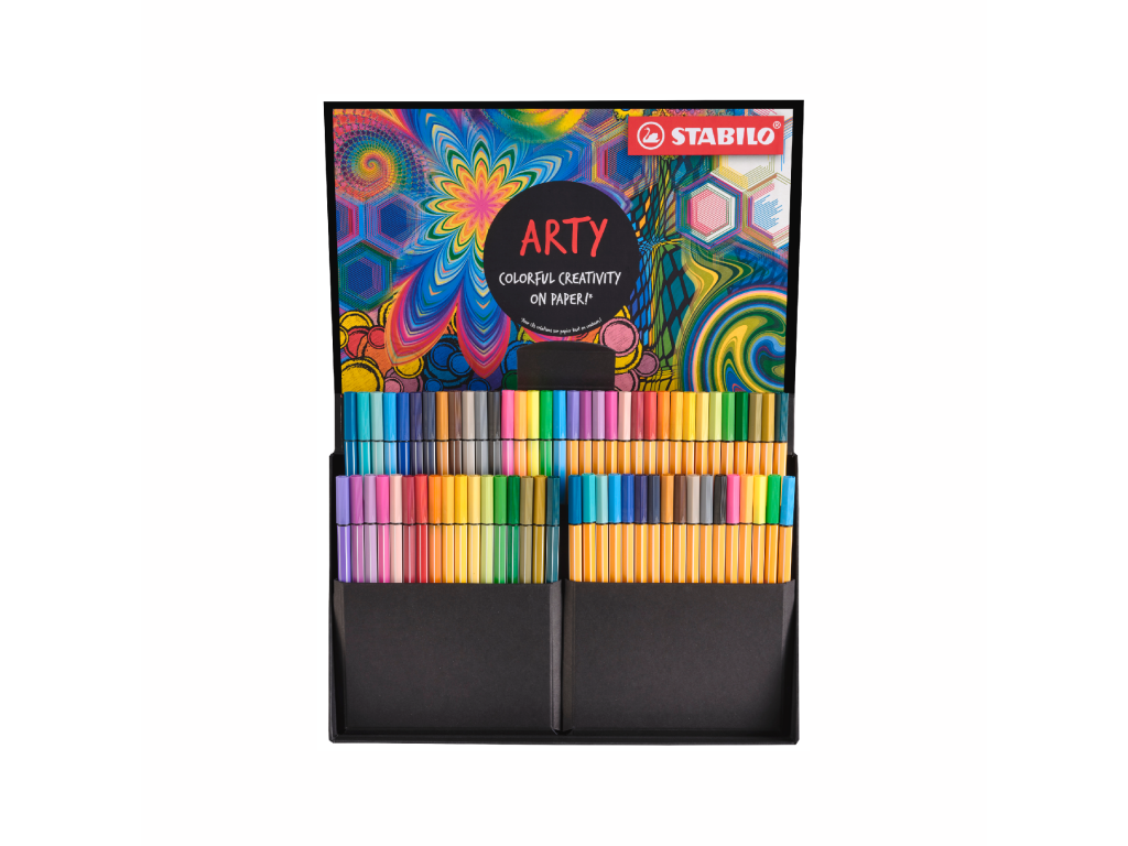 Souprava - Kreativní sada STABILO ARTY - 68 ks sada - jemné linery a prémiové vláknové fixy Pod barevně potištěnou fólií je umístěna kvalitní černá krabička z matného kartonu. Logo STABILO je vyraženo v horní části krabice. Pokud krabičku otevřete, barvy per září v intenzivním kontrastu s černým vnitřkem krabičky. Různé produkty jsou rozděleny samostatnými, černými přihrádkami, aby byl zajištěn přehled a řád v krabici. Prémiový vzhled a kvalita dělají z tohoto balení úžasný dárek pro každého kreativního ducha nebo (hobby) umělce. V krabičce jsou tak krásné všechny produkty, že si je opravdu chcete vzít do ruky – upoutá pozornost na každém kreativním pracovišti.Doplňkové parametry