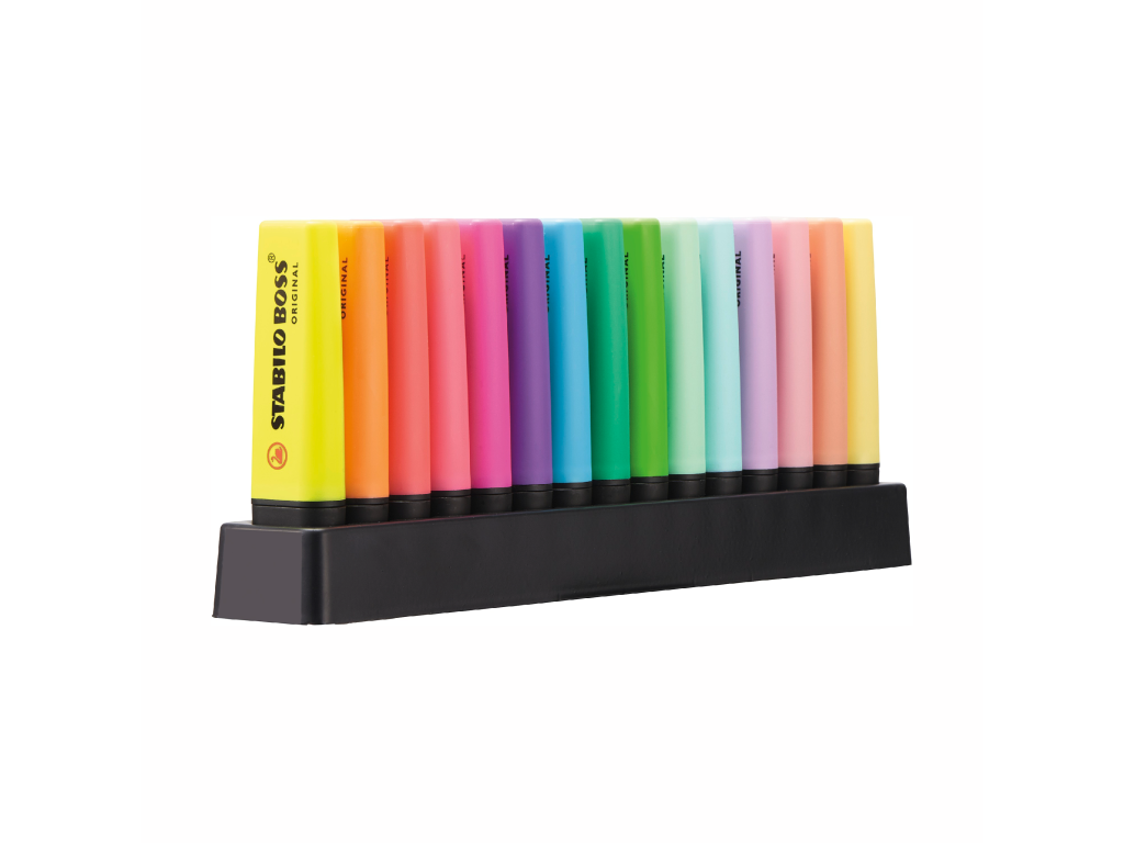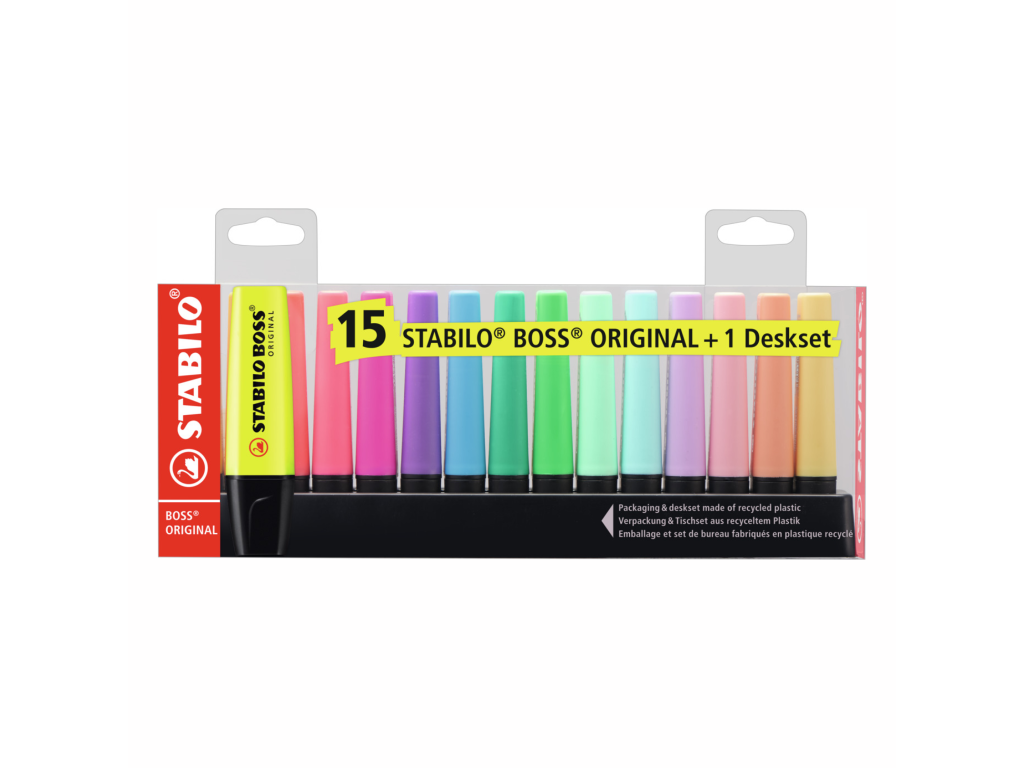 Zvýrazňovač - STABILO BOSS ORIGINAL - 15 ks deskset - 9 neonových a 6 pastelových barev Zvýrazňovač pro každého, kdo se při čtení potřebuje soustředit na to podstatné. STABILO BOSS ORIGINAL nabízí nejvyšší kvalitu zpracování a pohodlí při psaní. Díky technologii STABILO Anti-Dry-Out nabízí čtyři hodiny ochrany proti vysychání. Zvýrazňovač, který lze znovu naplnit náplněmi STABILO BOSS, je nyní k dispozici v 9 jasných neonových barvách a 14 jemných pastelových odstínech.Doplňkové parametry