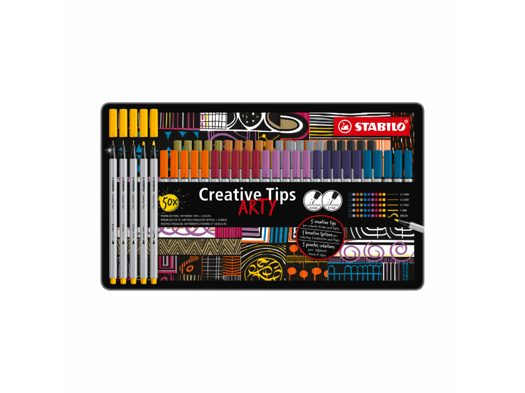 Kreativní set - STABILO Creative Tips - ARTY - 50 ks sada v plechu - URBAN - 10 různých barev STABILO Creative Tips lze používat různými kreativními způsoby díky různým šířkám stop a hrotům. Ať už jde o propracované monochromatické umělecké dílo nebo barevné nápisy, vysoce kvalitní linery a fixy jsou perfektními nástroji pro všechny druhy kreativních maleb. Zahrnují extra jemnou linku 0,2 mm a dvě jemné linky s odpruženými hroty o šířce stopy 0,4 mm a 0,7 mm, robustní fix s šířkou stopy 1 mm a fix s flexibilním štětcovým hrotem. Prémiový výběr pěti velikostí hrotu je k dispozici v různých sadách s různými barevnými kombinacemi. Inkoust všech linerů a fixů je na vodní bázi a lze je vodou rozmývat, což umožňuje vytvářet dechberoucí efekty a barevné přechody. STABILO ARTY je pro všechny kreativní lidi, kteří milují co nejpestřejší kreativní vyjádření – ať už jsou to začátečníci, pokročilí nebo profesionálové. Objevte velký výběr produktů s různými hroty od klínového hrotu po štětcový hrot. Díky různým vlastnostem produktů můžete pracovat různými technikami a kombinovat je, abyste vytvořili něco jedinečného. Vaše kreativita nezná mezí. Ať už tužka, pastelka, štětec nebo fix – teď je řada na vás!Doplňkové parametry