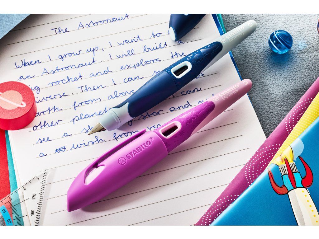 Ergonomické plnicí pero pro leváky s hrotem pro začátečníky A - STABILO EASYbirdy 3D DreamWorld Special Edition růžová - vč. bombičky s modrým zmizíkovatelným inkoustem Ergonomické plnicí pero s protiskluzovou úchopovou zónou je k dispozici ve speciálních verzích pro leváky i praváky. STABILO EASYbirdy má unikátní vlastnost: díky 30 stupňovému nastavitelnému úhlu hrotu se přizpůsobí individuální poloze ruky dítěte, takže hrot vždy leží rovně na papíru, což usnadňuje psaní. Výsledkem je čistý a uhlazený rukopis bez šmouh a škrábanců. Perfektní systém těsnění náplně pro ochranu proti skvrnám od inkoustu. STABILO EASYbirdy obsahuje políčko na jmenovku. Super robustní školní plnicí pero je k dispozici v různých barevných kombinacích. Speciální edice STABILO EASYbirdy 3D DreamWorld rozšiřuje řadu STABILO EASYbirdy o dvě barvy a dva designy! Motivy vztahující se k pohádkovému světu a vesmíru jsou vyryty na měkkém povrchu plnicího pera, a lze je rozeznat hmatem.Doplňkové parametry