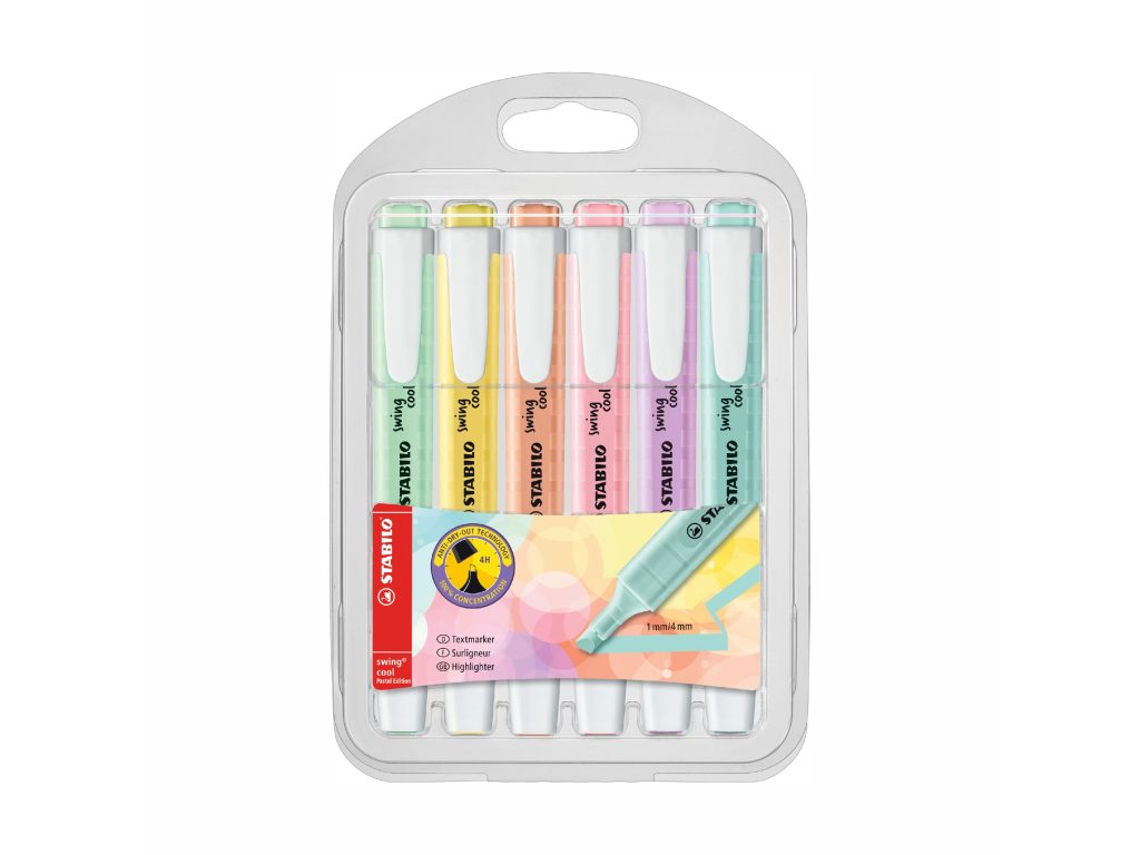 Zvýrazňovač - STABILO swing cool Pastel - 6 ks sada - 6 různých barev STABILO swing cool Pastel Edition je trendovou lahůdkou, kterou si hned zamilujete. Pro každého, kdo chce zvýrazňovat na cestách a hrát si s jemnými barvami, je STABILO swing cool v pastelových barvách dokonalým nástrojem. STABILO Anti-Dry-Out Technologie poskytuje 4hodinovou ochranu před vysycháním a umožňuje tak plně soustředěnou práci. S praktickým klipsem a úzkým tvarem je dokonalým společníkem na cestách.Doplňkové parametry